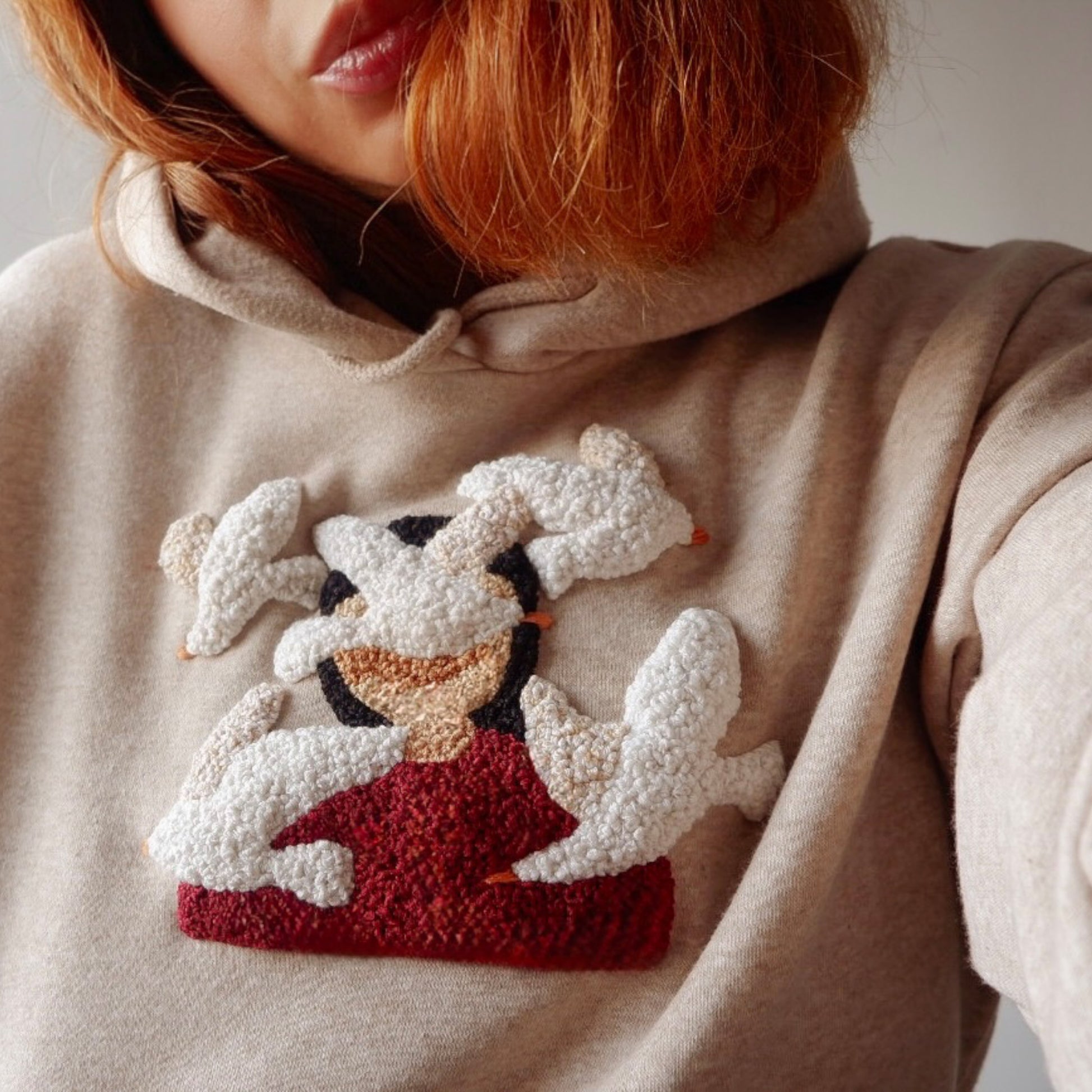 Hand Embroidered Flying Birds Hoodie - Textured Embroidery Sweatshirt - Artisan Made Oatmeal Beige Pullover