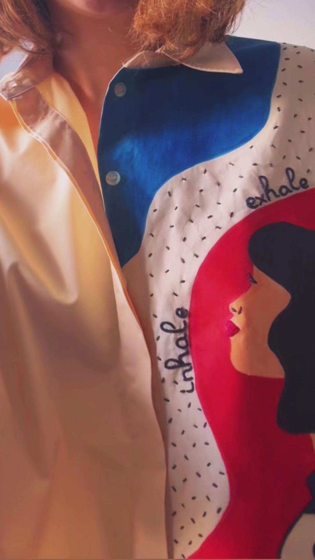 Deep Breaths is a hand painted and hand embroidered shirt created with intention and care. Each piece is made by hand from start to finish, combining expressive brushwork with delicate embroidery to create a wearable artwork that feels calm, personal, and timeless.